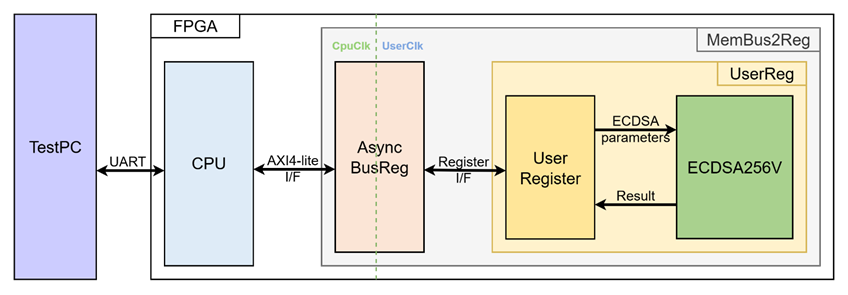 Since the CPU system and the ECDSA256V-IP operate in different clock domains, the AsyncBusReg module inside MemBus2Reg is implemented as an asynchronous circuit to support clock domain crossing.