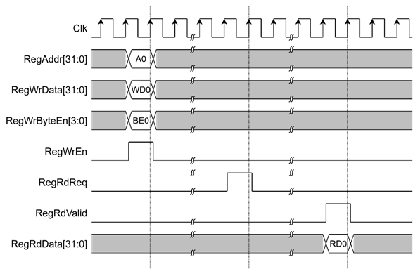 To write register, RegWrEn is asserted to ‘1’ with the valid signal of RegAddr (Register address in 32-bit unit), RegWrData (write data of the register), and RegWrByteEn (the byte enable of this access: bit[0] is write enable for RegWrData[7:0], bit[1] is used for RegWrData[15:8], …, and bit[3] is used for RegWrData[31:24]).