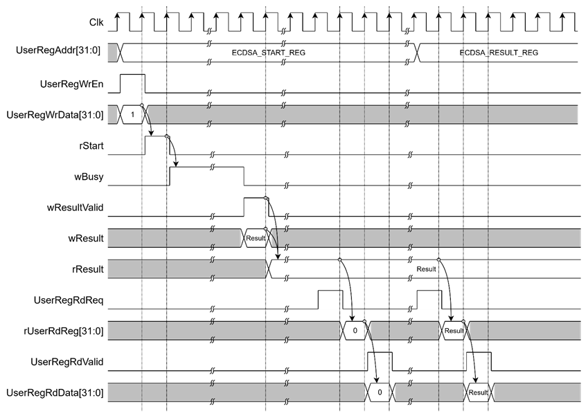 To start the verification process, the CPU writes to ECDSA_START_REG, which asserts rStart for one clock cycle. The ECDSA_START_REG can also be read to monitor the rBusy status. Once wBusy is de-asserted, the verification result can be obtained by reading ECDSA_RESULT_REG as illustrated in Figure 4.
