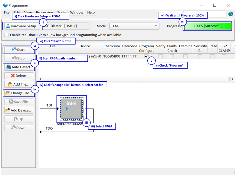 4) Open Quartus Programmer to program FPGA through USB-1 by following step.