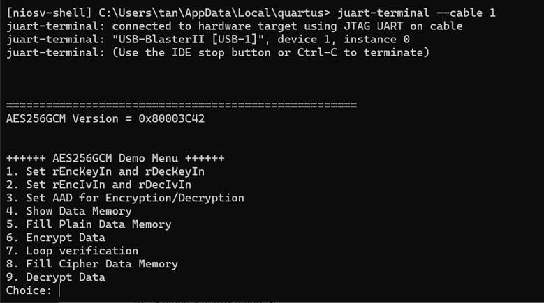 User can fill RAMs with AAD, plain or cipher data patterns, set encryption/decryption key, IV and control test operation via Nios Command Shell. When configuration is completed, AESGCM-IP demo command menu will be displayed as shown in Figure 3. The detailed information of each menu is described in topic 4.