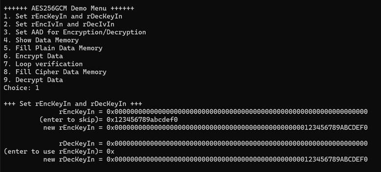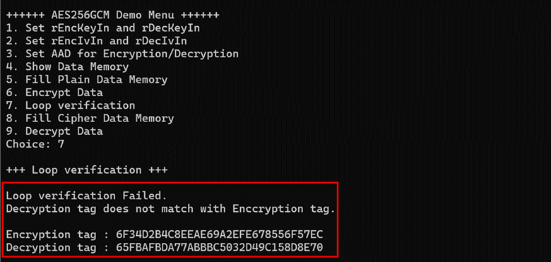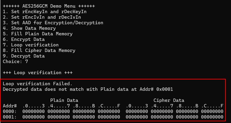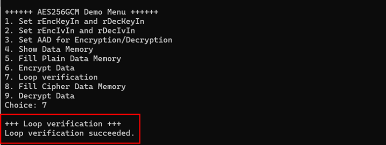 Select “Loop verification”, to check both encryption and decryption. In this menu, plain data in memory will be encrypted with current encryption key, IV and AAD and be stored in cipher data memory which is already cleared.