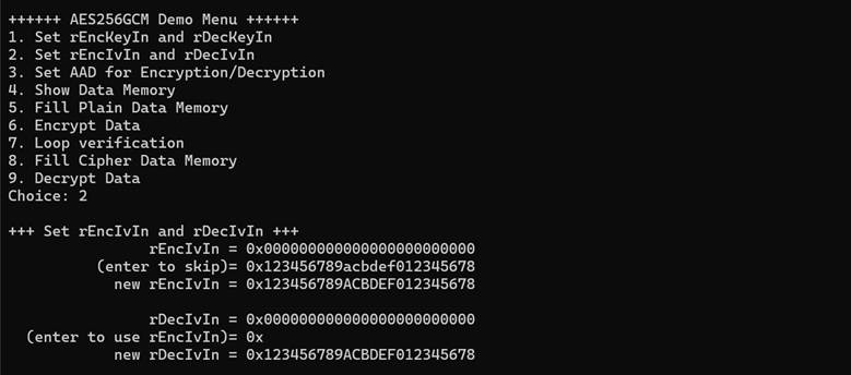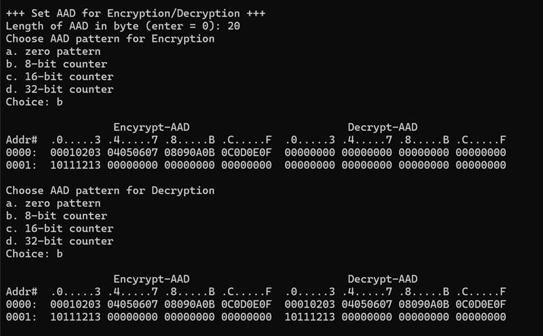 b) Input the desired length of AAD in byte. This length will be used for both encryption and decryption. In case of zero-length AAD operation, user can input “0” or press “enter” then end process of this menu. In case of non-zero-length AAD, user can select AAD pattern for encryption and decryption as shown in Figure 6.