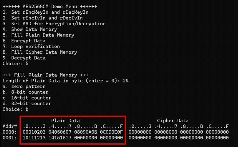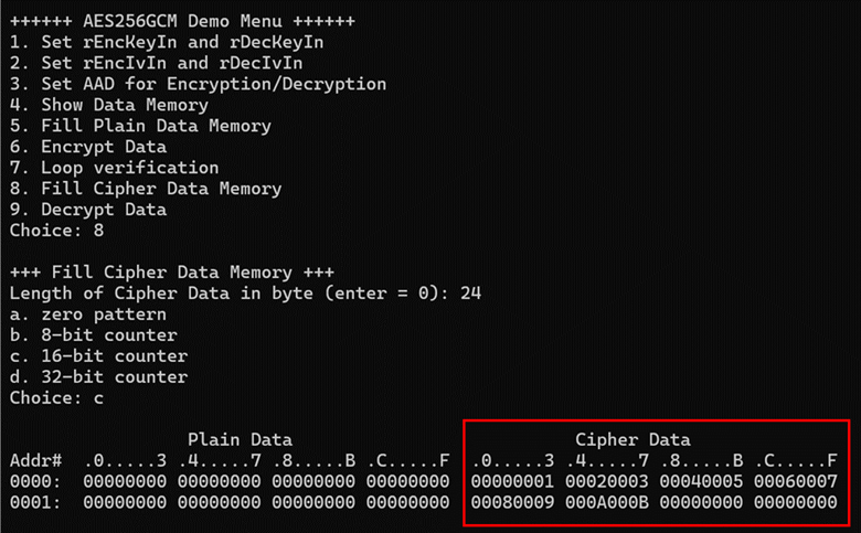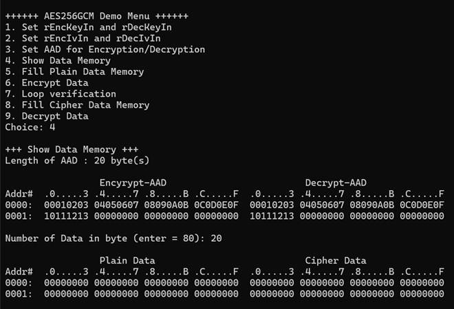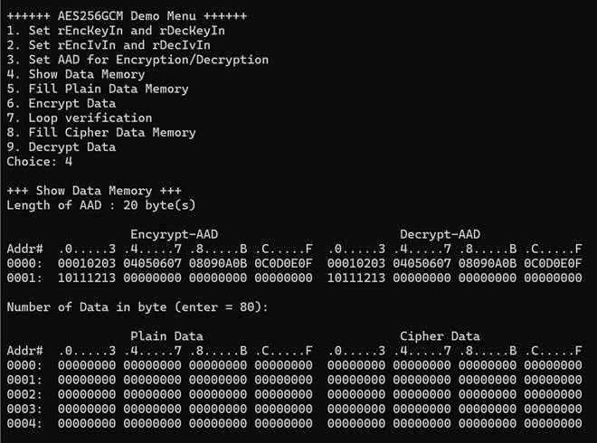 To show AAD and data in memory, user can select “Show Data Memory”. AAD will be shown by the number of AAD that user already set in menu “Set AAD for Encryption/Decryption”. User can input the desired length of data in byte to show. Both plain data and cipher data will be displayed in table-form as shown in Figure 7.