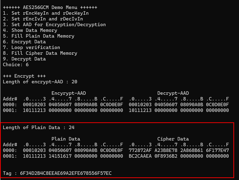 Select “Encrypt” to encrypt plain data in memory. Current length of AAD, encryption AAD and length of plain data are printed on serial console. When the encryption process is finished, both plain data and cipher data will be displayed in table-form and 128-bit encryption tag will be printed as shown in Figure 10.
