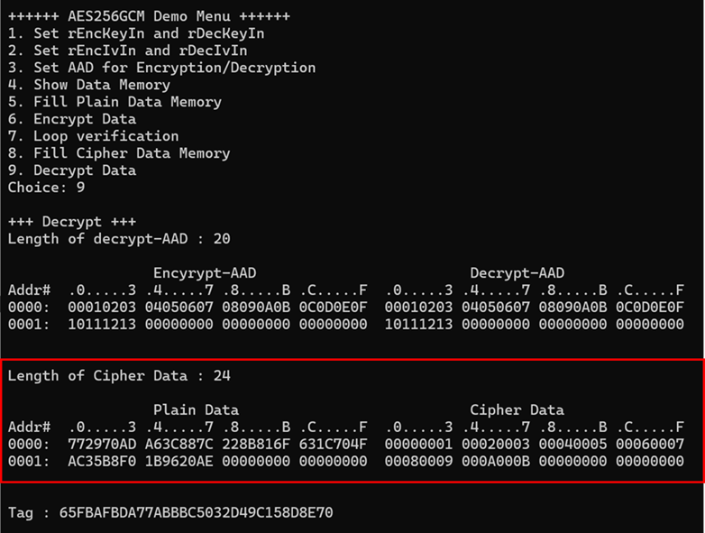 Select “Decrypt” to decrypt cipher data in memory. Current length of AAD, decryption AAD and length of cipher data are printed on serial console. When the decryption process is finished, both plain data and cipher data will be displayed in table-form and 128-bit decryption tag will be printed as shown in Figure 15.