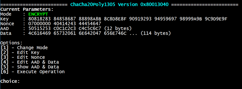Select “Change Mode” from the main menu to switch the ChaCha20Poly1305-IP operation mode. The available options are shown in Figure 4.