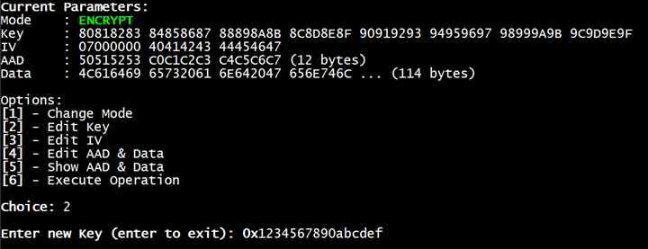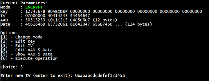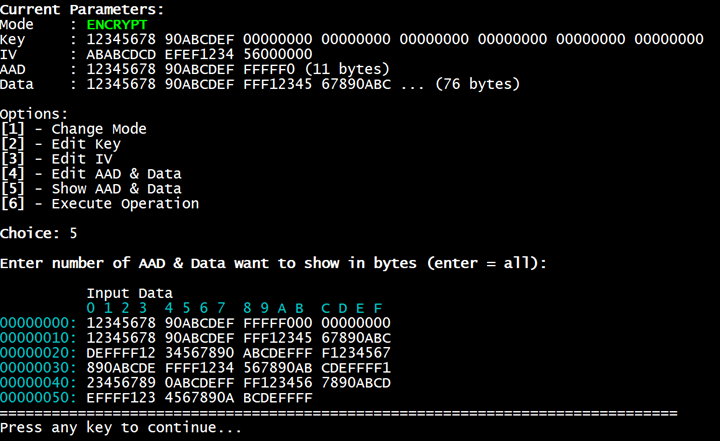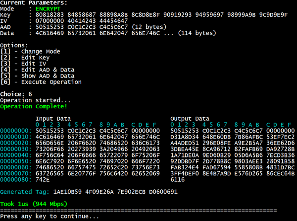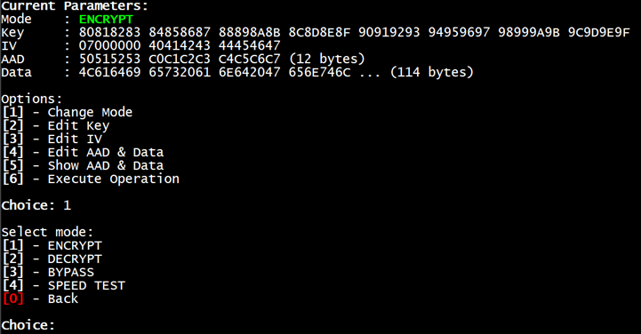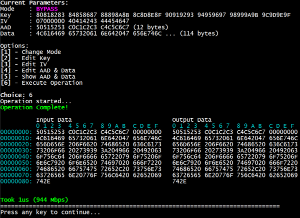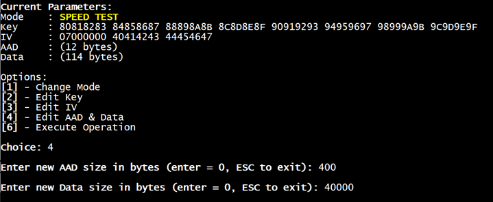 User can fill RAMs with AAD, IV, Input Data, and encryption/decryption key via serial console. The current parameters are shown together with the available options in the main menu as shown in Figure 3. The details of each menu are described in topic 4.