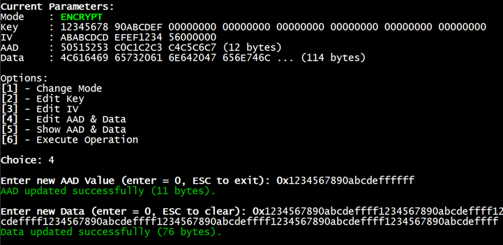 Select “Edit AAD & Data” to update AAD and Data in memory. Users must update both AAD and Data in this menu. Editing differs by mode: