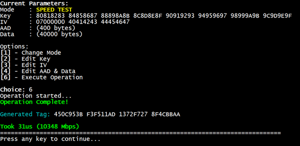 In Speed Test mode, the IP ignores the actual AAD and Data values. Only the entered sizes, together with the current key and IV, are used to run the encryption process. The console shows the execution time and calculated throughput, as shown in Figure 13.