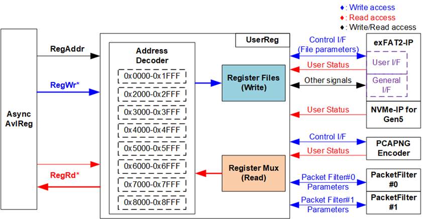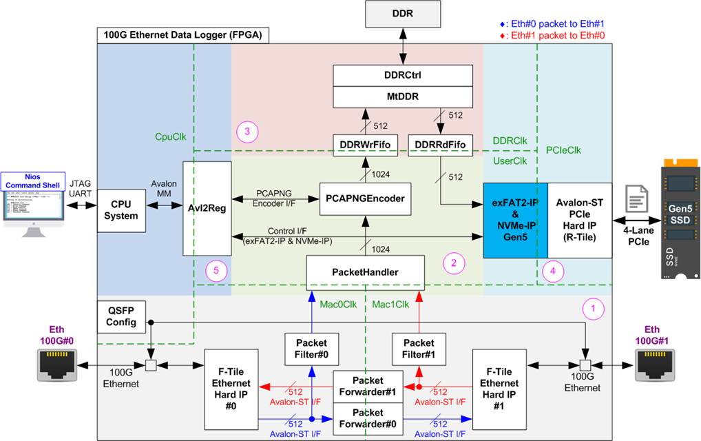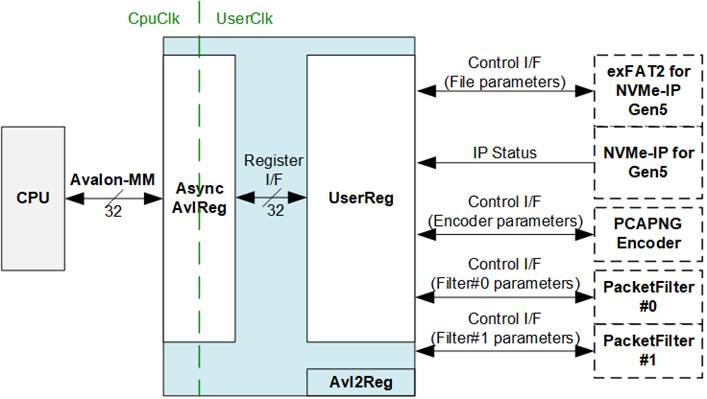(4) File System and NVMe Storage: This block consists of exFAT2-IP, NVMe-IP Gen5, and R-Tile PCIe Hard IP modules. This block handles file system management and high-speed data storage. Using exFAT2-IP and NVMe-IP Gen5, the system writes PCAPNG files directly to the NVMe Gen5 SSD through the R-Tile PCIe Hard IP. File system commands and parameters required by exFAT2-IP are controlled by the CPU via the Avl2Reg interface.
