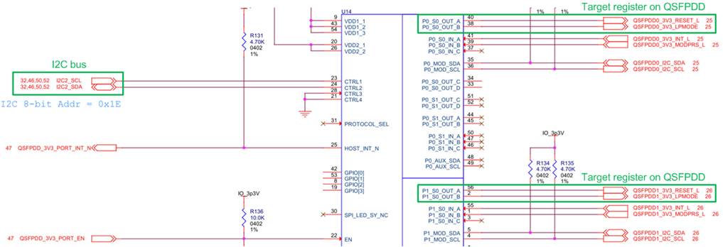 2) Reset QSFPDD: The Output Value Register of the P0 and P1 ports is written with I2CStartAddr=0Ah and I2CDataOut=00h to assert ‘QSFP_RESET_L’ to 0b.
