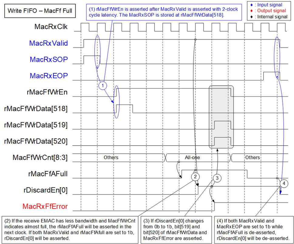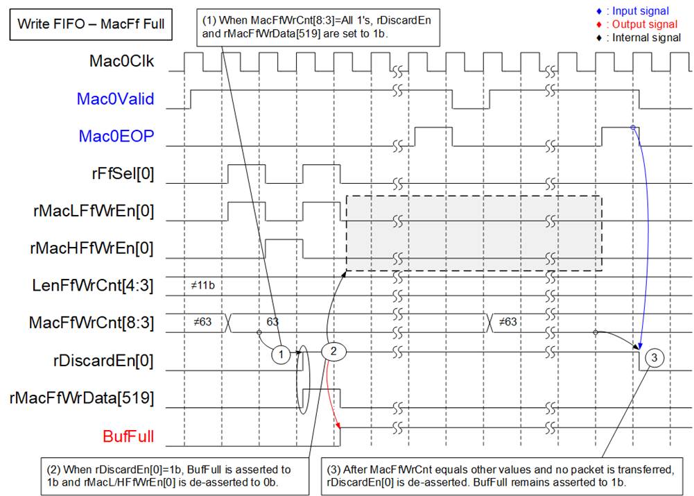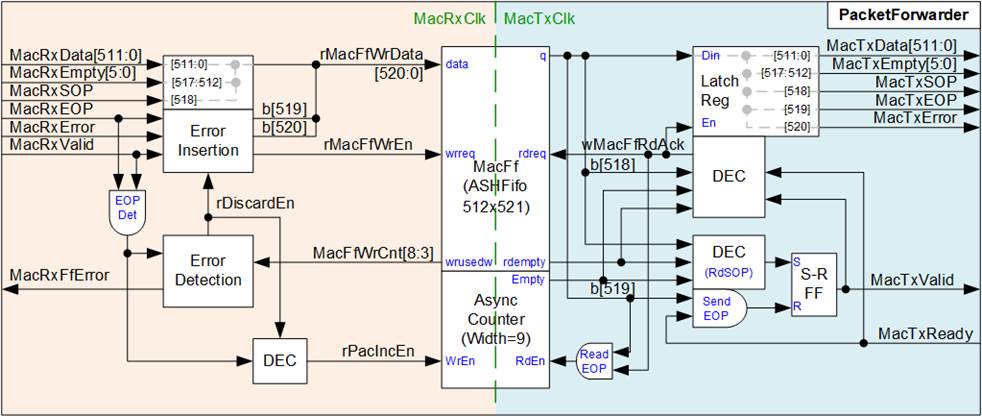 Further details of the PacketForwarder logic are described in the following two subsections: Write FIFO interface (operates in the MacRxClk domain) and Read FIFO interface (operates in the MacRxClk domain).