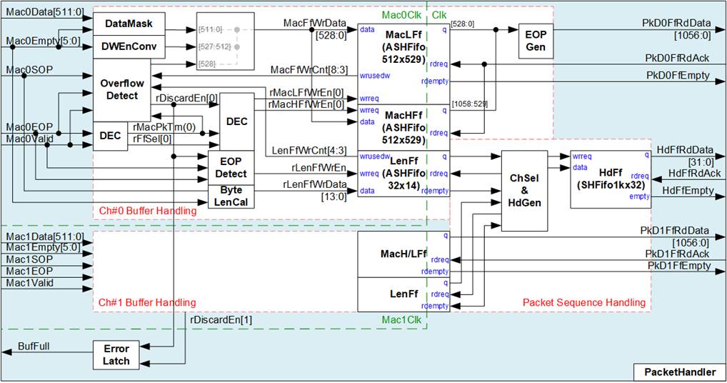 During normal operation, the received Ethernet packet is written directly to the asynchronous FIFO (MacFf). Each FIFO entry contains 521 bits of information, consisting of 512-bit packet data, 6-bit Empty field (indicating the number of valid bytes in the final data strobe), 1-bit SOP (Start of Packet) flag, 1-bit EOP (End of Packet) flag, and 1-bit Error flag.