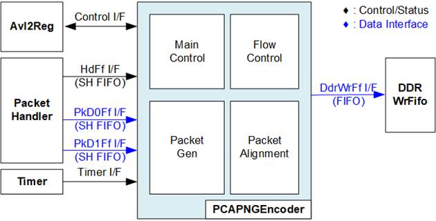 (2) Packet Processing and Encoding: This block consists of PacketHandler and PCAPNGEncoder modules. The packet processing block receives filtered packets from both Packet Filter instances. The PacketHandler merges the two 512-bit input streams into a single 1024-bit data stream and forwards it to the PCAPNGEncoder. The PCAPNGEncoder converts the incoming packets into the standard PCAPNG file format and outputs the encoded data to the DDR buffering block.