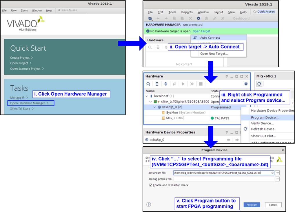 a) For KCU116 board: Utilize the Vivado tools for programming. Open the Vivado Hardware Manager and program the board with the required bit file as illustrated in Figure 17.
