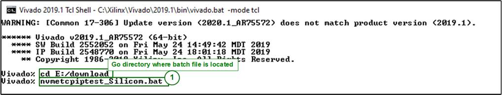 Use Vivado TCL shell to download the configuration file and the firmware. Browse to the download directory that includes bat file, pdi file, and elf file. After that, run the test by typing following command.