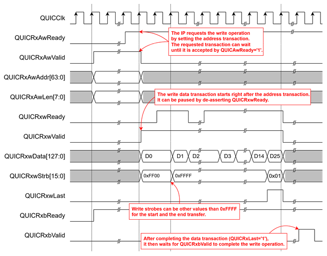 · Core Interfaces: The remaining interfaces run at the IP core clock frequency, called QUICClk, which is recommended to be set greater than 200 MHz for optimized performance.