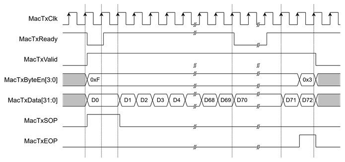When the QUIC10GC-IP requests to send a packet, it sets MacTxValid to 1 along with the valid values of MacTxData, MacTxSOP, MacTxEOP and MacTxByteEn. The transmission can be paused if MacTxReady is de-asserted to 0 at any clock cycle and resumed afterward. MacTxByteEn[3:0] indicates which bytes within MacTxData[31:0] are valid. For example, MacTxByteEn[0] indicates the validity of MacTxData[7:0], and MacTxByteEn[1] for the validity of MacTxData[15:8]. MacTxSOP is set to indicate the start of a packet, while MacTxEOP is asserted to indicate the end of a packet. Figure 26 depicts an example of sending a packet.