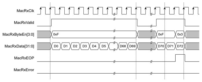 On the other hand, Figure 27 shows an example of receiving a packet. To start receiving a packet, MacRxValid is asserted to indicate valid data on MacRxData[31:0]. MacRxByteEn[3:0] is used to indicate which bytes within MacRxData[31:0] are valid, and MacRxEOP is asserted to indicate the end of a packet. If an error occurs during reception, MacRxError will be asserted to 1 at the end of the packet, and the receiving packet will be discarded. In this example, the reception of data (D0 to D72) happens when MacRxValid is asserted.
